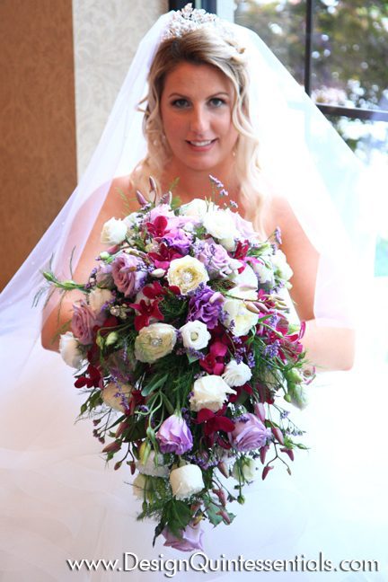 As we’ve completed the invitation design and crossed it off from “to-do list”, the next project, body flowers and wedding décor. Christina’s ONLY request for her bridal bouquet were BIG and BLING so I created a cascade bouquet and added lots of jewelry. The bouquet holder was used with extra large in silver handle. I’ve to admit, just the bouquet holder itself was generous and beautiful (anything for my BFF). And for the flowers I used shades of purple roses, purple orchids, purple Limonium, purple Lisianthus, white roses and white Stephanotis (the smell of Stephanotis…). Then I added the pearl jewelry into the roses and Stephantois. The bouquet itself was heavy and weighted a ton (according to the bride); however, she loved it so much and was in tears when she saw the bouquet for the first time. As for me, I was so glad to be part of her big day and always a pleasure seeing the smile on my brides.