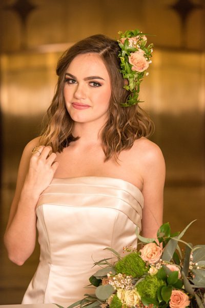 I couldn’t resist sharing photos from this styled collaboration. You’ll see from the images below how well the champagne colored rose looked amongst a touch of greenery. Even consider how the champagne colored dress contrasts with the gold door in the Fisher Building.