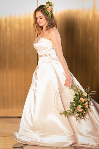 During the second styled collaboration, we had the opportunity to work with this yellowish-orange, and almost beige color. I was so excited when Christine called upon me for collaboration and couldn’t pass up on the opportunity. It turned out to be a very fun shoot at the Fisher Building in Metro Detroit. The gold interior complemented the luxurious champagne in a very unique. It was classy and bold. The colors truly reminded me of royalty.