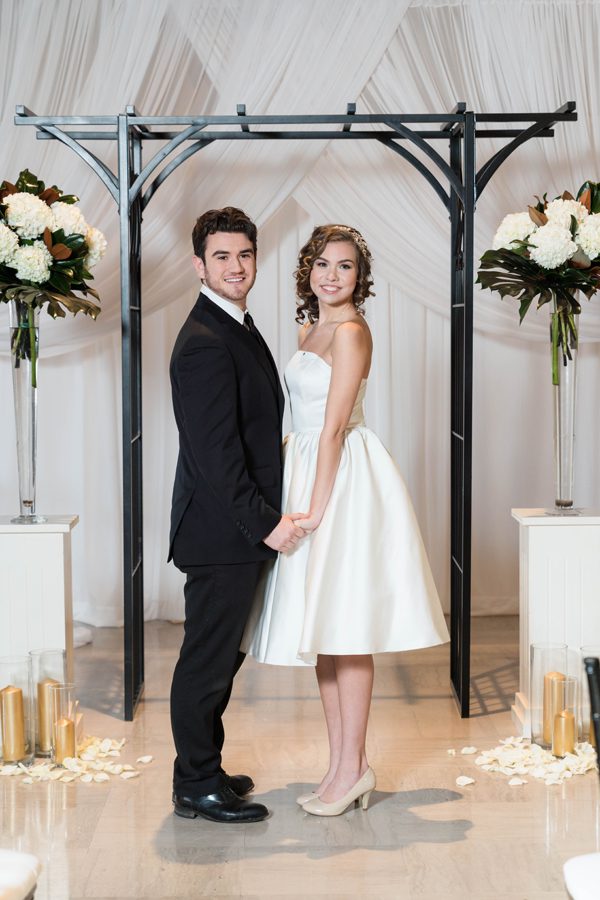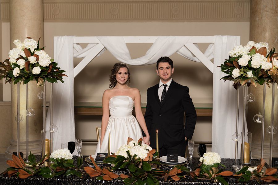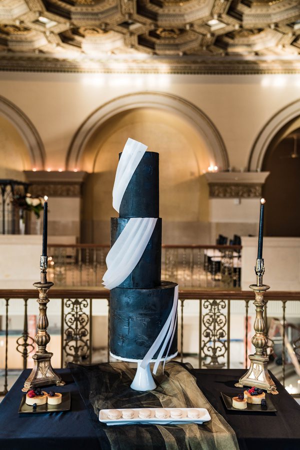 When I tell you that we were both simply floored with the detailing of the venue. If I had to choose one word for it I’d say exquisite. The 35-inch coffered gold-leaf ceiling and majestic tall Palladian windows were just two of the many things that stood at the Treasury. Immediately we knew we wanted to feature the gold color of the building, along with another element to make a statement. Ultimately, we went with the color theme of black and white with hints of gold. Black was the main star of the show, but we also wanted to use the accent of gold from the building.